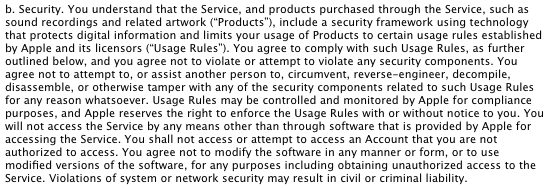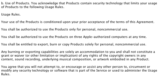 Apple yesterday launched their music service. Encrypted AAC 128 kbps. DRM enforced by iTunes 4. Apple reserves the right to modify the Usage Rules at any time. US only. Compared to other music services which use DRM, it’s the least fair use-hostile.